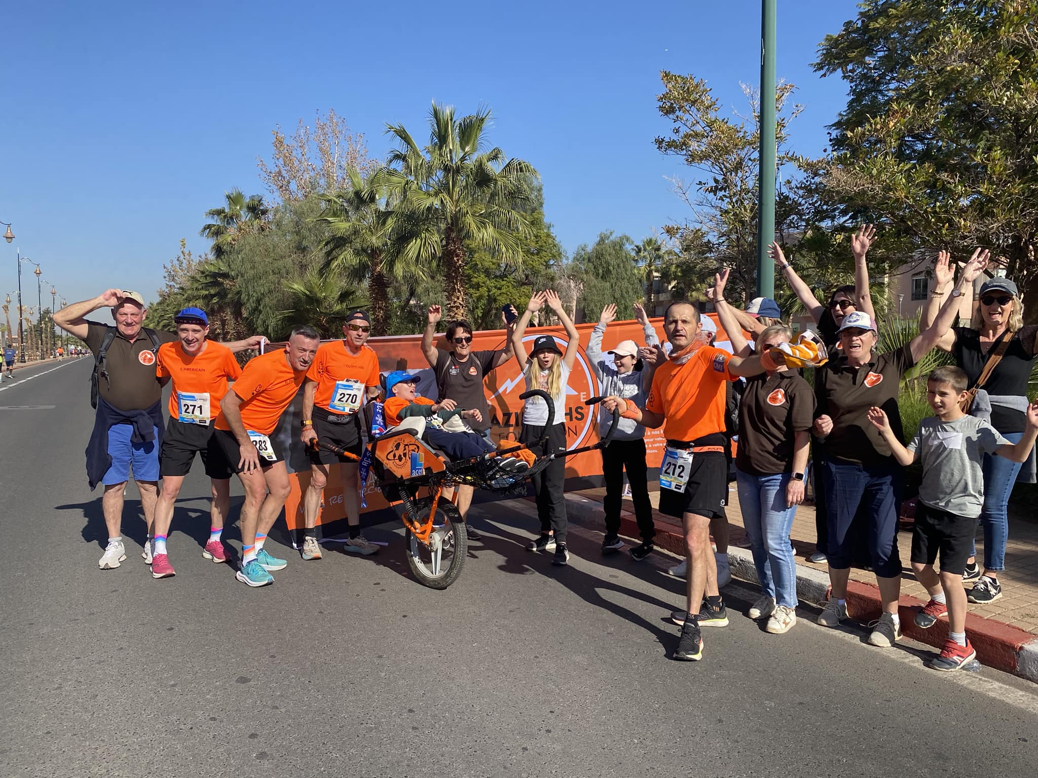 C’est la première fois que Sacha vient à Marrakech. Les PRA ne compte plus eux car de nombreuses courses se déroulent au Maroc avec un passage obligé dans cette ville impériale. Pour son baptême de joëlette à l’étranger, Sacha, qui a déjà couru avec l’association à Colmar (68), est bien décidé à capturer un maximum de souvenirs lors du Marathon. Et il a de la chance car ce n’est pas une mais trois courses qui l’attendent. En effet, la veille de l’épreuve reine est d’abord organisée une course de bienvenue. Une petite mise en jambes de 3 km réservée aux coureurs étrangers. À peine le temps de se reposer, Sacha enchaine avec la course réservée aux élèves des écoles de Marrakech. Sitôt le départ donné, c’est une vague qui déferle, multicolore, impressionnante d’énergie communicative, le souffle court et le cœur rempli d’adrénaline, Sacha en son centre.