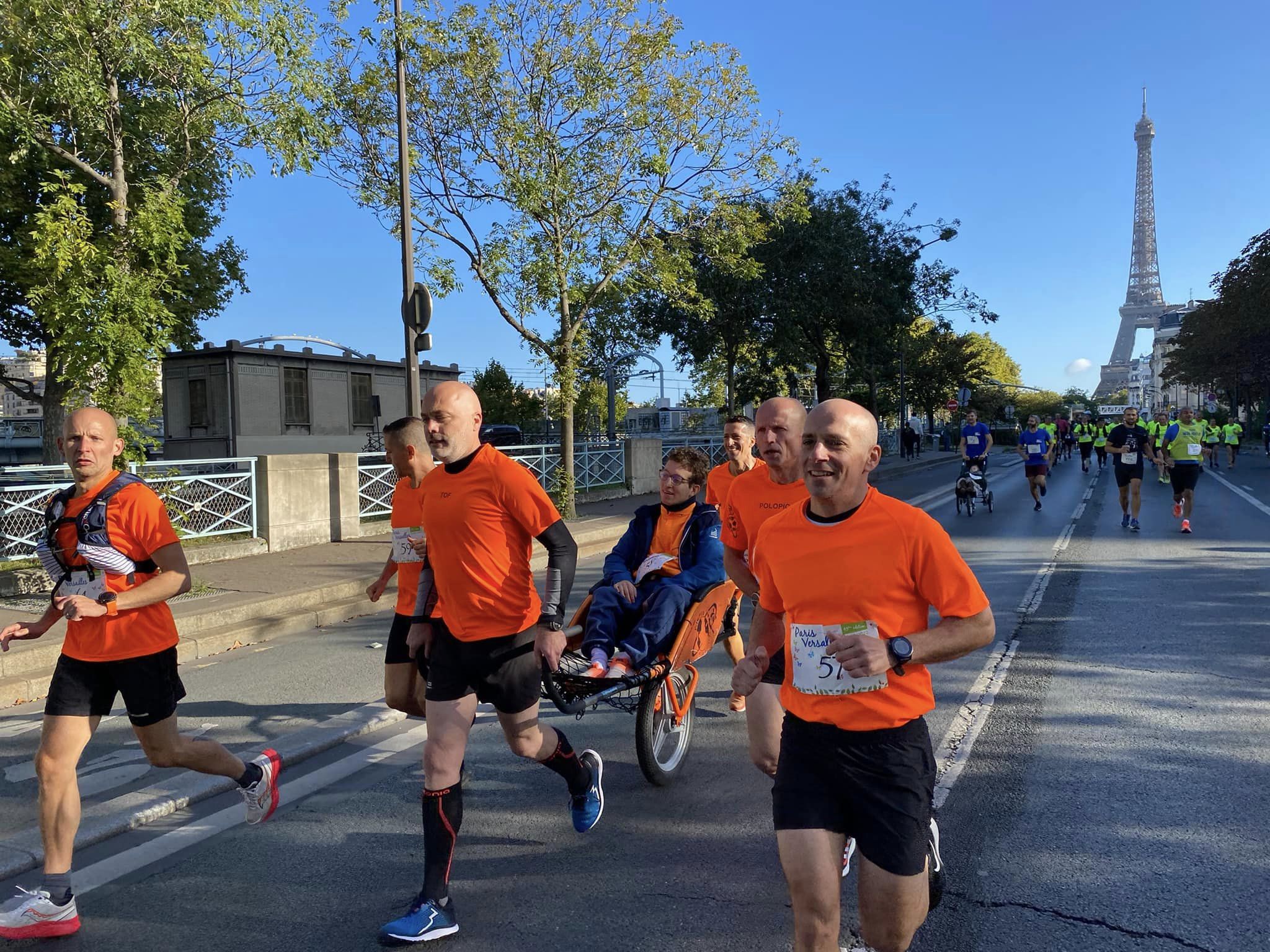 Sur sa chaise à por­teurs mais avec une roue quand même, Le départ se fait aux pieds de la Tour Eif­fel, accom­pa­gné entre autres des asso­cia­tions du Vivre Ensemble, des Dunes d’espoir. Nous y croi­sons Clé­ment, Chris­tian et Adil, ain­si que Myriam qui repré­sen­tait l’association lors du Raid la Sah­raouiya. D’un tra­cé plat, nous pas­sons à la tant redou­tée côte des gardes et une fin de par­cours royale face au Châ­teau de Versailles.