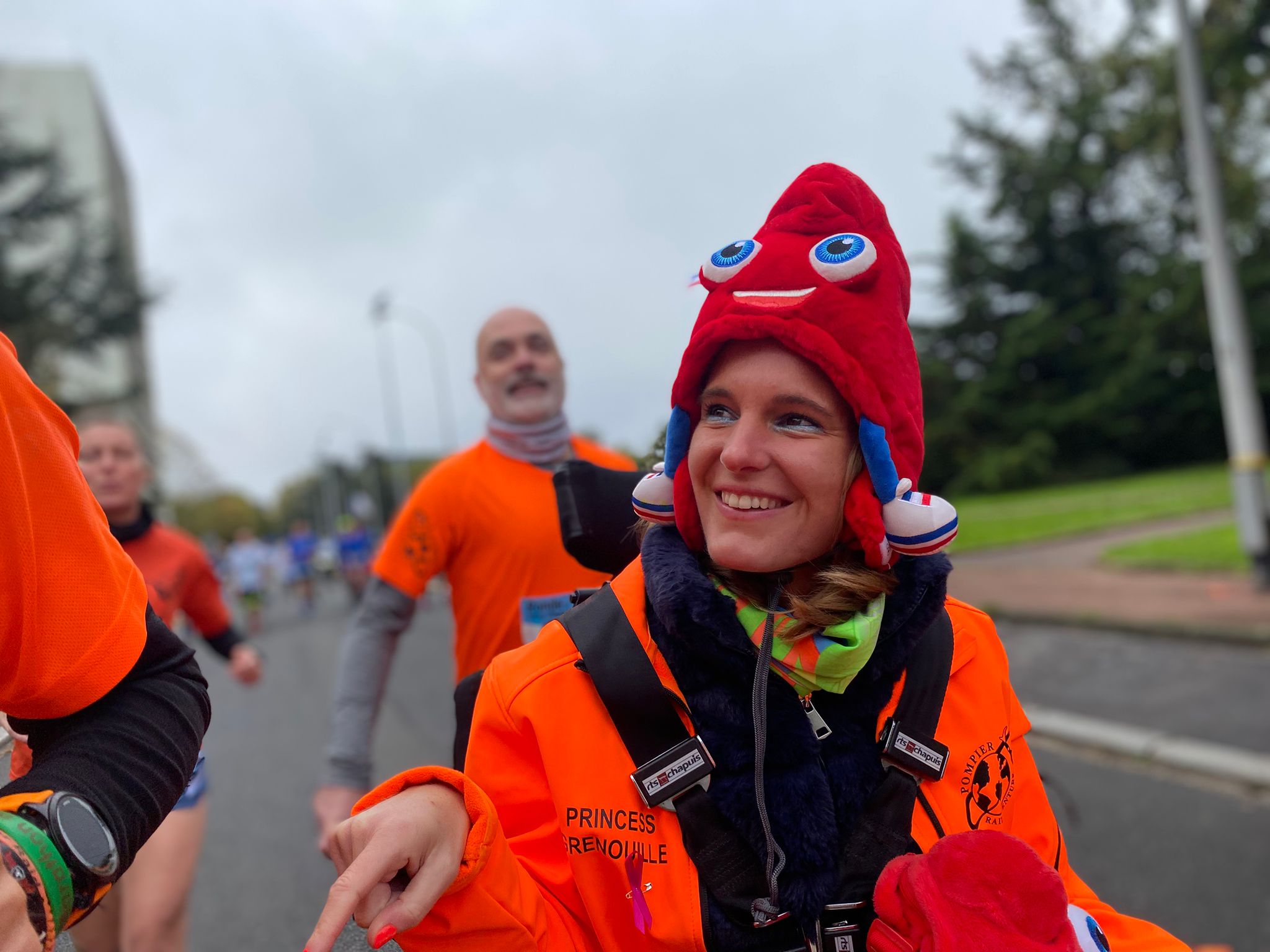 Ce n’est pas Marianne avec son bonnet phrygien mais bien Coline. Elle est notre Marianne, la Marianne des PRA. Aux commandes de la joëlette, Coline irradie par son sourire chaque personne qu’elle croise, coureurs, supporters ou simple spectateur. C’est son habitude, personne ne resiste au sourire de Coline. Alors il en est de même pour cette ronde vélizienne. Un bonheur comme à chaque fois.