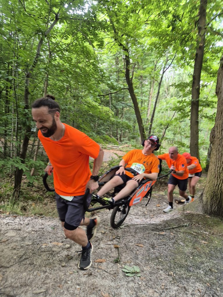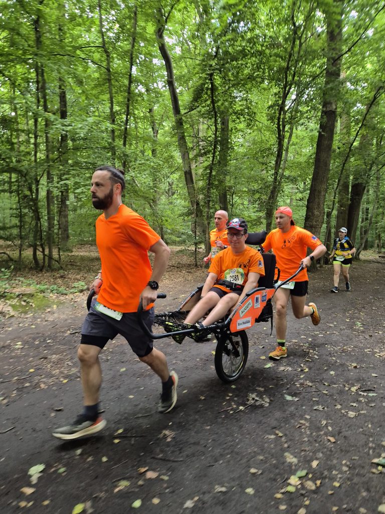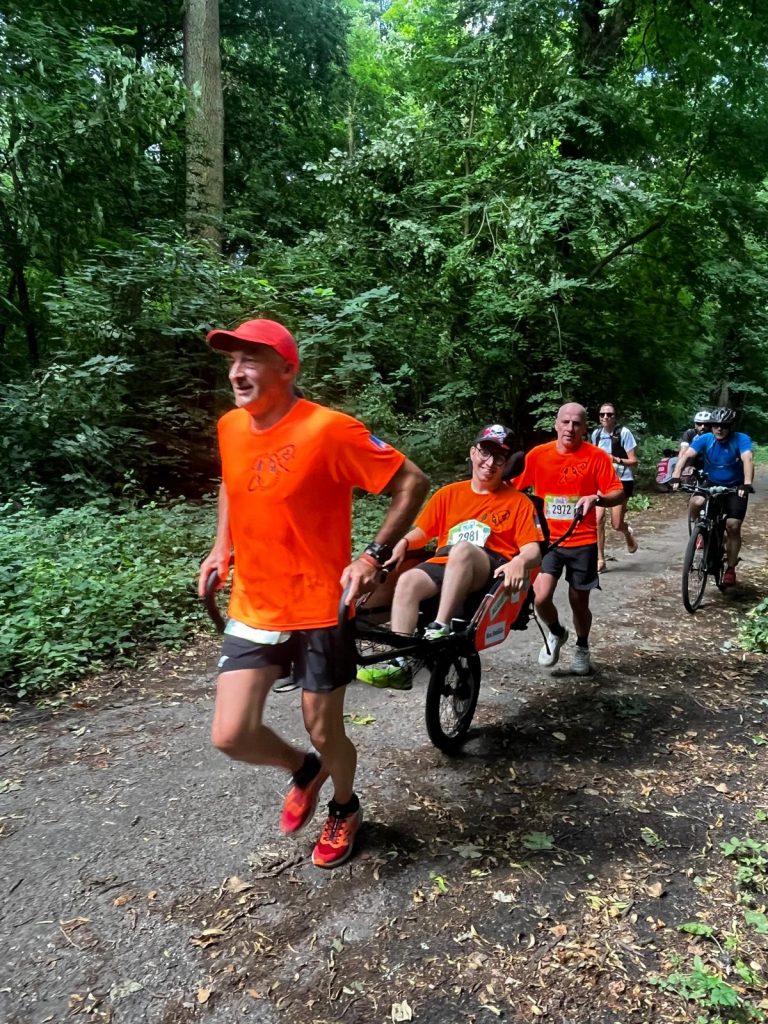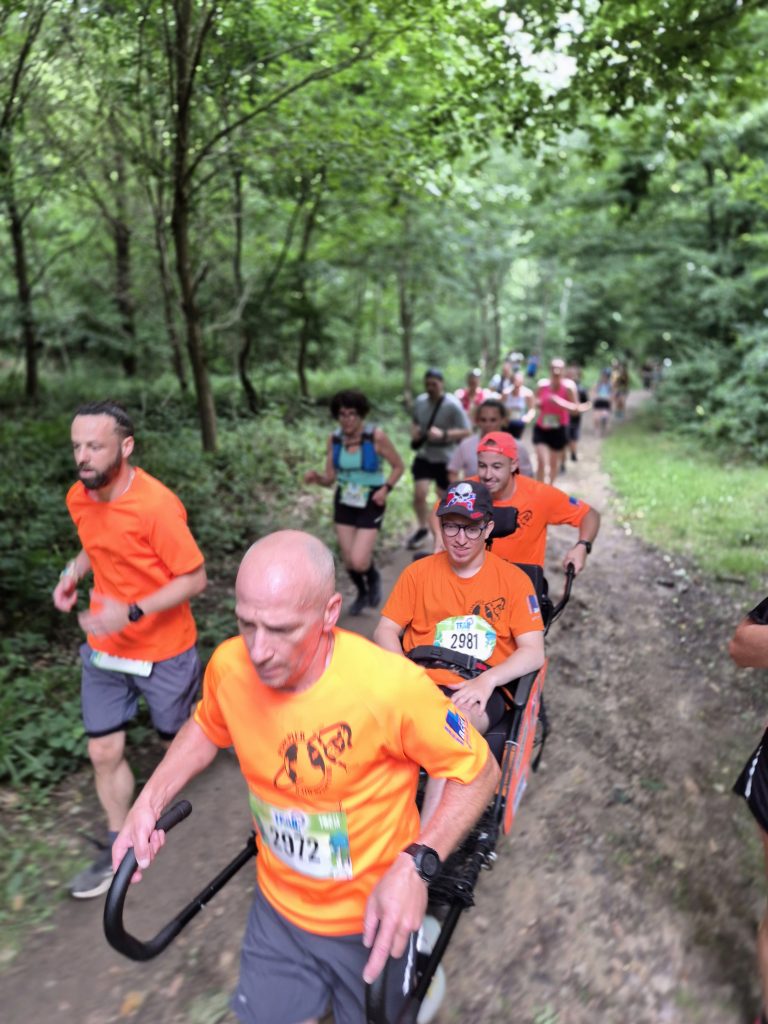 Elouan, le pas­sion­né de belles auto­mo­biles, a pris le volant de la joë­lette du sou­rire ce matin, pour un ral­lye spor­tif dans les bois meu­don­nais. Mais pas ques­tion pour lui de s’arrêter cueillir des fleurs et en plus ce n’est pas la sai­son. Dire qu’il est un brin heu­reux de par­ti­ci­per au Trail du Muguet est fina­le­ment un brin léger. Cela fai­sait d’ailleurs quelques temps que l’association n’avait pas eu le bon­heur de cou­rir avec lui donc les PRA sont tout aus­si heureux.